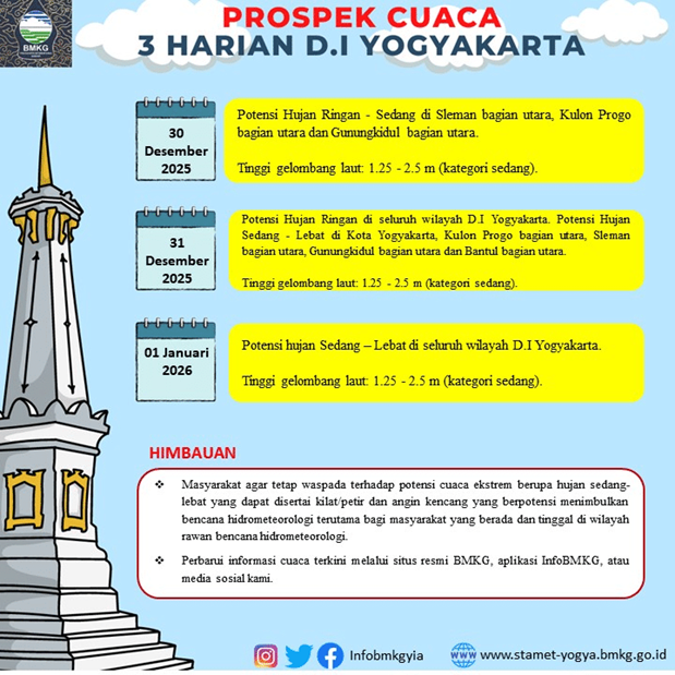 Pada malam pergantian tahun baru 2026 BMKG memprediksikan akan terjadi hujan di Kota Yogyakarta. Pada Rabu tanggal 31 Desember 2025 Kota Yogyakarta berpotensi hujan sedang hingga hujan lebat dan pada 1 Januari 2026 diperkirakan seluruh DI Yogyakarta berpotensi hujan sedang sampai dengan hujan lebat. Prakiraan BMKG tersebut perlu diperhatikan oleh seluruh masyarakat untuk waspada dan mengantisipasi dampak yang terjadi.